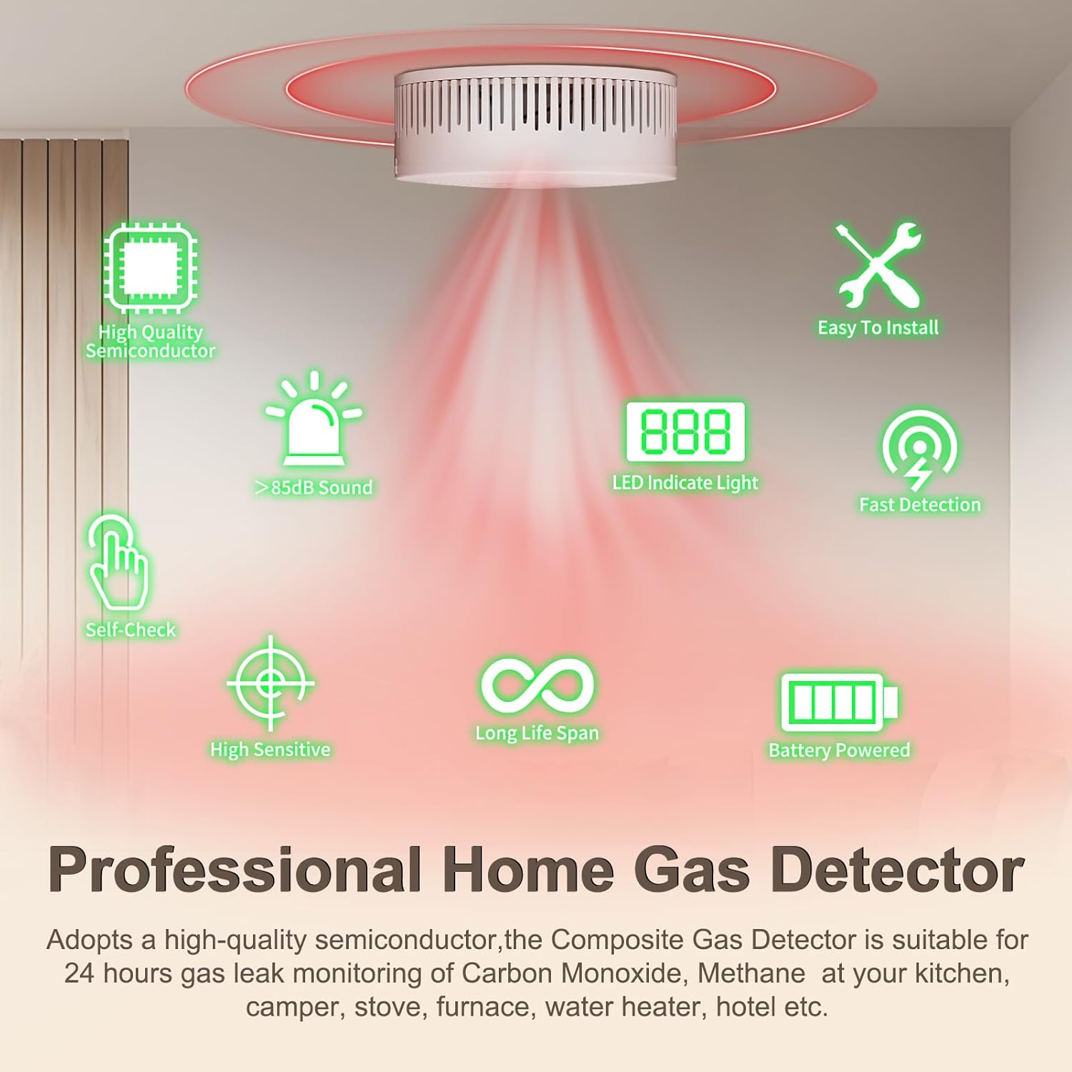 Our Natural Gas and CO Alarm operates entirely on batteries, eliminating the need for complex wiring or external power sources. This makes it an ideal choice for home, RV, apartment, and kitchen safety—ensuring you have reliable protection wherever you are.